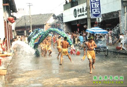 張家界潑水龍又叫“澆水龍”,于唐朝時(shí)期由移居本地的白族興起演變而成,在永定區(qū)的尹家溪鎮(zhèn)西尹村、莫家崗村十分盛行,是當(dāng)?shù)?a class="insidelink" href="http://www.xmuisedu.com/fengqing/1130174734.html" target="_blank" title="土家族">土家族,白族、苗族在天熱干旱時(shí)節(jié)求雨祈福的一種形式。一旦出現(xiàn)旱災(zāi),當(dāng)?shù)仡^面人物就會(huì)出來組織潑水龍,演出極其隆重。