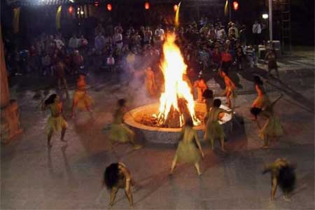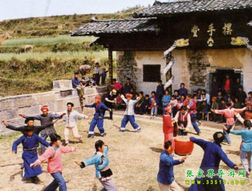 “擺手”,土家人稱為“社巴”,正月初三至十七日這段時(shí)間稱為“社巴日”或“社巴節(jié)”,歷史上,土家人在各村寨都建有“擺手堂”和神廟。在神廟內(nèi),還供有土家族的祖先八部大王或土司王神像.每到“社巴節(jié)日”都有歌舞活動(dòng)。這種調(diào)年擺手舞叫“社巴”也有叫“調(diào)年”的,有強(qiáng)烈的戲劇性,有故事情節(jié),還有人物,它由拔普(公公)、拔帕(婆婆)、阿達(dá)與阿柯等男女老少集體在而舞。 擺手舞的形式一般是這樣的:在擺手堂的中央高掛龍旗,四方點(diǎn)燈,由金童玉女給土家人用銅盆洗手,再從香火山取來神火,然后在龍旗下點(diǎn)燃3堆篝火。隨著3聲炮響,先由梯碼法師(巫師)手舉八寶銅鈴作前導(dǎo),大家跟著翩翩起舞,徹夜不眠。 擺手舞的主要?jiǎng)幼髟谧呗放c彎腰時(shí),擺動(dòng)同邊手。擺的形式,一般分單擺、雙擺、環(huán)擺、花擺、插擺與擺七步等,因?yàn)閿[得多,所以稱“擺手舞”。擺手舞,還分“小擺手”與“大擺手”。“小擺手”的規(guī)模的較小,形式與內(nèi)容主要是模擬挖地、播種、薅包谷草、摘包谷或者是在田里插秧、扮谷、曬谷等多項(xiàng)農(nóng)事活動(dòng),也有表現(xiàn)打獵或漁獵活動(dòng)的。有些地方的“小擺手”舞也有表現(xiàn)吹木葉、接新娘等生活內(nèi)容的。 “大擺手”,主要是規(guī)模大,參加的單位往往是幾個(gè)甚至幾十個(gè)村寨,參加的人數(shù)也幾千人或上萬甚于幾十萬人的。“大擺手”的內(nèi)容比“小擺手”豐富,除表現(xiàn)農(nóng)事活動(dòng)和土家人生活以外,還有表現(xiàn)軍事活動(dòng)的。“大擺手”的形式,一般先由領(lǐng)頭人手執(zhí)五彩布條做的“柳巾”指揮,接著是“梯碼”隊(duì)(由巫師組成)和鼓樂隊(duì),同時(shí),男女?dāng)[手舞隊(duì)也一起入場(chǎng)。這其中還有特別引人注目的披甲小旗隊(duì)(他們身披打花鋪蓋象征盔甲)。這支披甲小旗隊(duì)手執(zhí)小花旗,顏色有紅有綠,有黃有藍(lán),色彩艷麗,五彩繽紛。他們表演的內(nèi)容與形式,主要是反映人類起源,先民軍事活動(dòng)、部落搬遷等,舞蹈動(dòng)作難度較大,為廣大土家人所喜愛。
