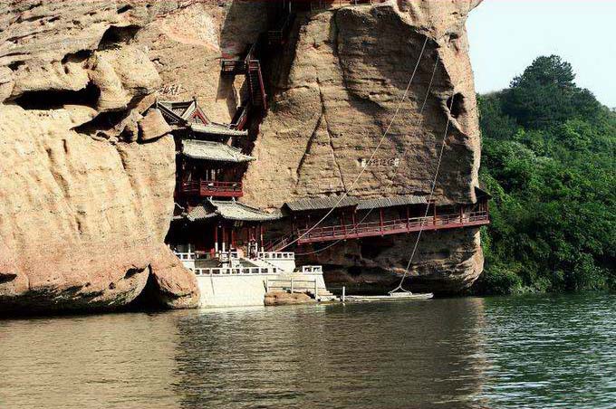 水巖在旱仙巖北面,靠上清河兩岸,因臨水而名,以碧水丹山而聞名遐邇,主體在西岸。要主景點有古棧道遺址、飛云閣、棋盤石、“仙女獻花”、仙梳石、金鐘峰、仙勺石、雌雄石等。怪石奇巖,滿山紛陳,隨處是景,目不暇接。從龍虎山莊附近乘船行不遠,對岸即是水巖,只見崖壁貼岸,陡立如屏,古樹橫生,藤蔓垂掛,山崖上古棧道遺址依然存在。在崖壁上有許多名人題刻,如“玉壁凌空”、“半天仙跡”、“神仙可接”等。至一峽口上岸,左側即絕壁獨立的“仙女獻花”。沿山徑上山,一路美景不斷。對岸亦是高峰聳立河邊,上清河蜿蜒中間,青山碧水,幽景迷人。
