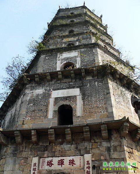 塔高10丈5尺,磚石結構,七層八棱,石階旋梯。正門西南向,上方漢白玉橫額鐫刻著斗大楷書“珠暉塔”三字,兩邊漢白玉雕刻楷書對聯(lián):“高峙船山遠綿學脈,流回耒水廣助文瀾”。塔基四周刻有飛禽走獸圖形,塔內拱門嵌有石刻碑文,為江蘇學政王先謙撰寫、寧夏知府黃自文手書,原為6塊,現(xiàn)存4塊。塔前建有廊廡,僧房數楹。塔尖銅頂,映日生輝。