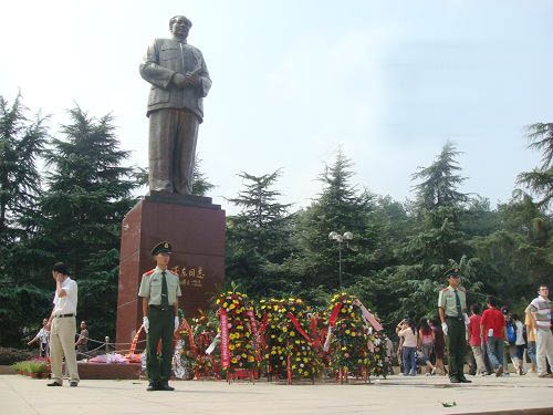 毛澤東銅像重3.7噸,像高6米,基座高4.1米,通高10.1米,象征著“10.1”國慶,更象征著毛澤東是新中國的締造者。像面朝東南方,身著中山裝,左胸前掛著“主席”證,手執(zhí)文稿,目光炯炯,面帶微笑,正視前方,巍然挺立,成功地再現(xiàn)了人民領(lǐng)袖毛澤東出席開國大典時的風(fēng)采。銅像褐紅色大理石基座正面,鐫刻著中共中央總書記、國家主席、中央軍委主席江澤民1992年題寫的“毛澤東同志”五個貼金大字。