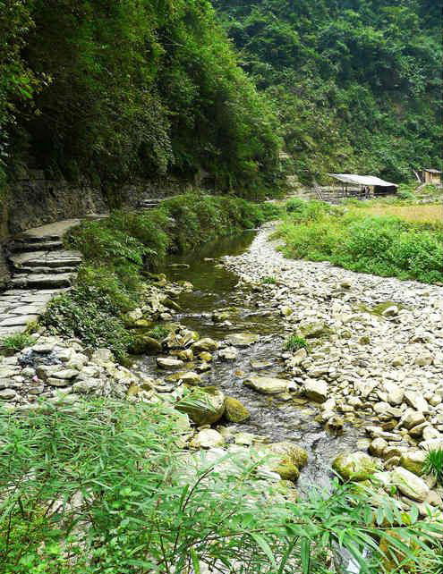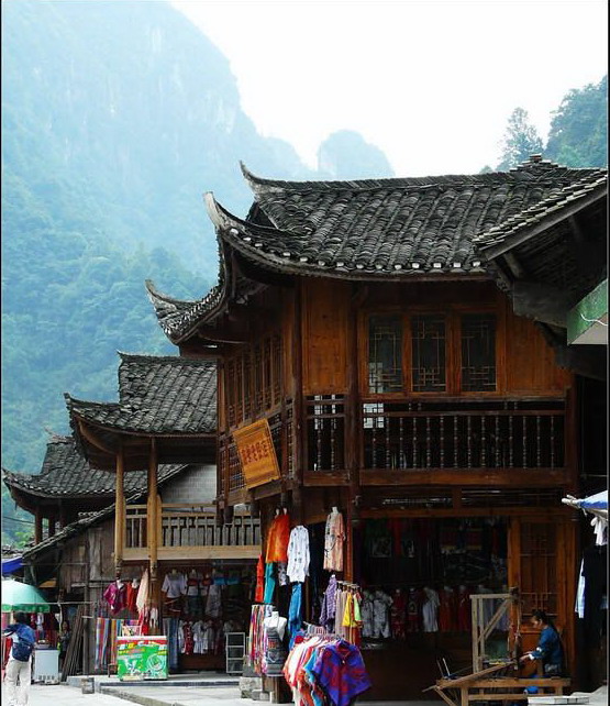 德夯村位于峽谷深處,有八十余戶苗家,緊緊相依于翠谷中;統(tǒng)一是鱗鱗灰瓦木屋,木屋間穿插著青一色的石板路、石板坪石板橋、石板墻,透著和諧、統(tǒng)一的美,整個(gè)村寨顯得恬適幽靜。